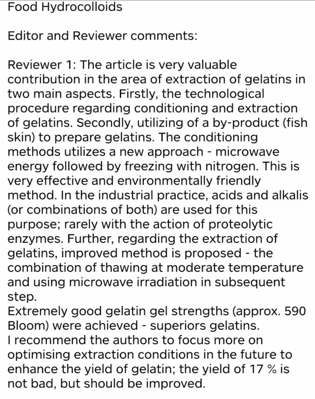 该技术已授权国家发明专利(一种鱼皮明胶制备方法及产品,ZL 2018 1 1457417.5),并于2022年3月在在食品领域TOP期刊《Food Hydrocolloids》以“A green extraction method for gelatin and its molecular mechanism”为题,发表学术论文。国际业内专家对该项技术的研发给予了高度肯定,认为这项技术的研发对于鱼皮高值利用和解决明胶产业污染问题方面做出了很有价值的贡献。