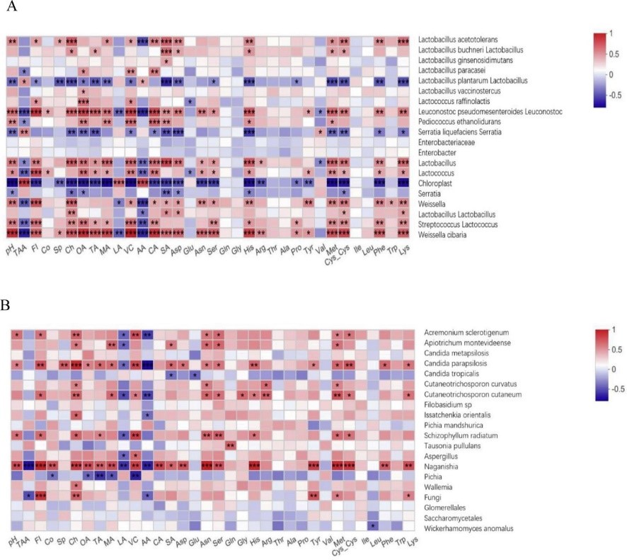 1.泡菜的理化特性(pH、总酸、21 种游离氨基酸、8种有机酸、4种质地特性)和优势细菌(A)和真菌(B)物种之间的 Spearman相关性热图