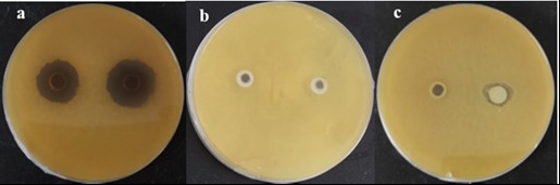 注:a:无菌上清液;b:有外包物的菌体;c:无外包物的菌体