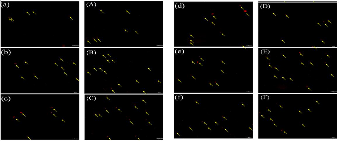 图2. pH为2.0-7.0的乳清分离蛋白分散体(a-f)和存在海藻酸钠的乳清分离蛋白分散体(A-F)的荧光显微照片