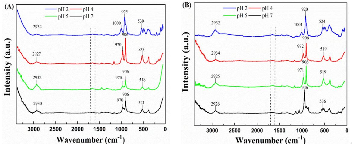 3.乳清分离(A)和乳清分离蛋白-海藻酸钠复合物(B)在pH 2.0–7.0的拉曼光谱