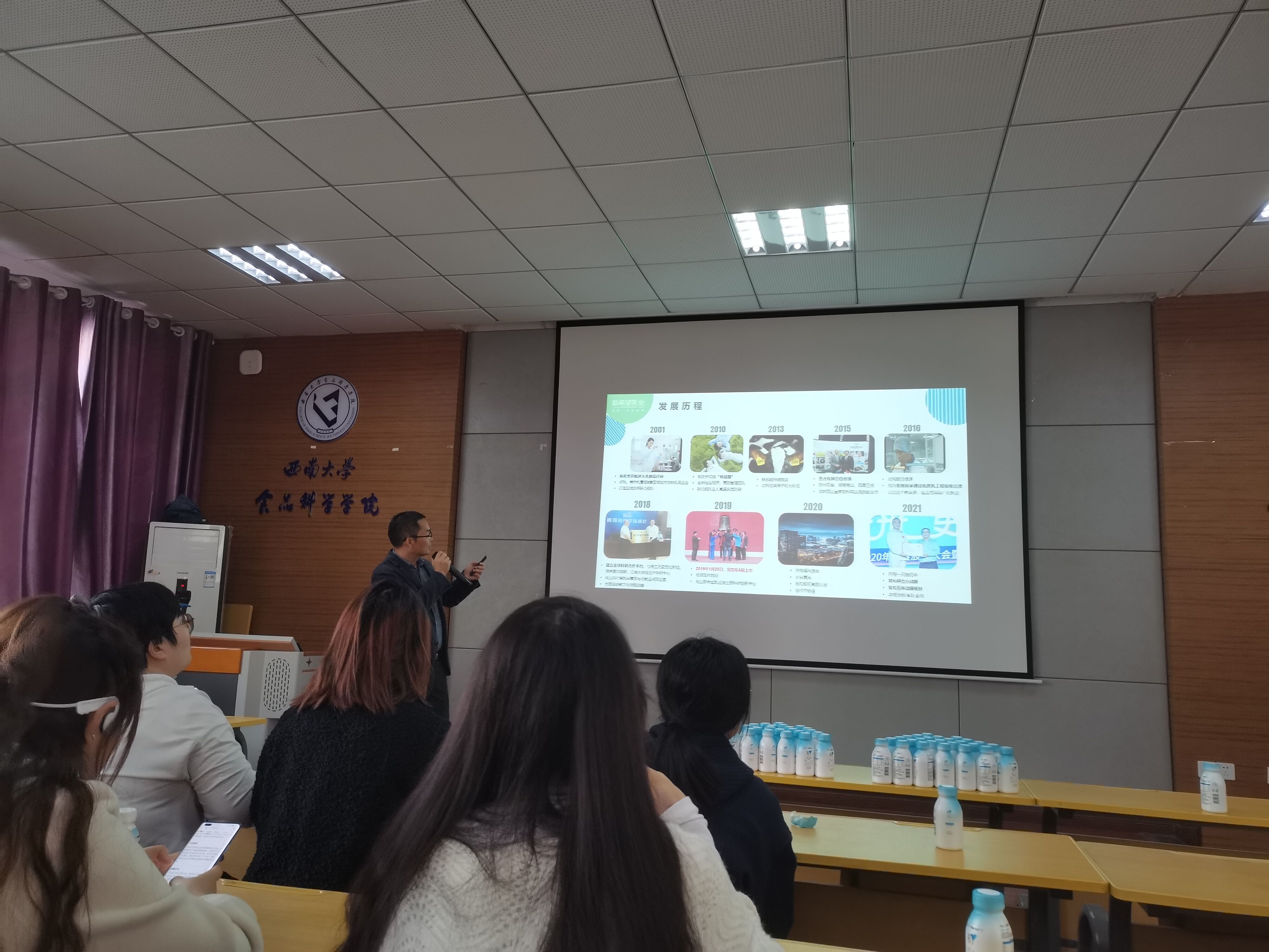 活动现场,新希望乳业负责人李启明为员工们详细介绍了新希望乳业的基本情况、发展历程、团队理念、科研情况及科研平台等方面的相关知识,同时也介绍了系列创新特色产品,比如无乳糖高品牛奶、黄金24小时鲜奶等。此外,bevictor伟德19届员工-新希望乳业科技研究院靳苗苗从求职者的角度出发,以自己的求职经历为例子,为学弟学妹们分享了自己的择业规划、在企情况等方面的求职经验,并给出了要“多经历生活,分开处理事情与情绪”的学姐寄语。最后,主持人罗敏从毕业生就业形势出发,进一步介绍了新希望乳业的岗位需求及给同学们的求职规划。