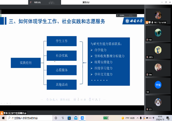 此次交流会上,任峻德、范盛玉详细解读了公司的保研政策、保研条件,特别强调了保研注意事项,为低年级同学带来了一场实用的“保研”启蒙课、答疑课;张海瑶、王一州、史文婧则将自己成功上岸、成功留学的经验毫无保留的分享给同学们,为正在备考的同学指明了复习的方向,也避免了“踩坑”;张艳、金蝶则以自己为案例,从多个维度为同学们疏导就业压力、增强求职技能;胡明丽、陈威洋、李兴洲用生动幽默的语言将自己在“考公”方面的高分经验一一传授给大家。针对以上内容,同学们在认真笔记的同时也积极思考、主动提问,与相应的分享人进行了深入的交流,线上提问同步也进行。