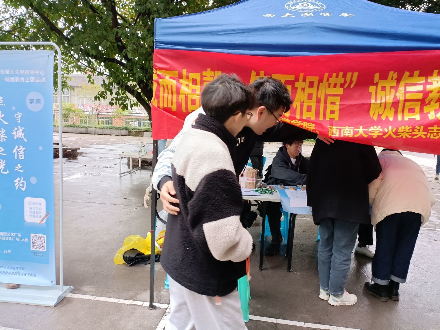 为深入学习贯彻党的十九大精神,围绕高校立德树人的根本任务,进一步加强老员工诚信教育,由伟德体育主办,bevictor伟德火柴头失物招领中心(火柴头志愿服务网络文化工作坊)、伟德体育员工党支部联合承办的“诚而相馨,信而相惜”诚信教育主题活动于12月11日在南区樟树林正式拉开帷幕,活动由员工党员和火柴头各院志愿者带头深入楠、竹、李、梅、橘、桃、杏七大宿舍园区,向在校师生发出“以‘诚’立身、以‘诚’立学、以‘诚’立业”的诚信倡议,并联名签署《“点火柴之光,守诚信之约”诚信倡议书》。