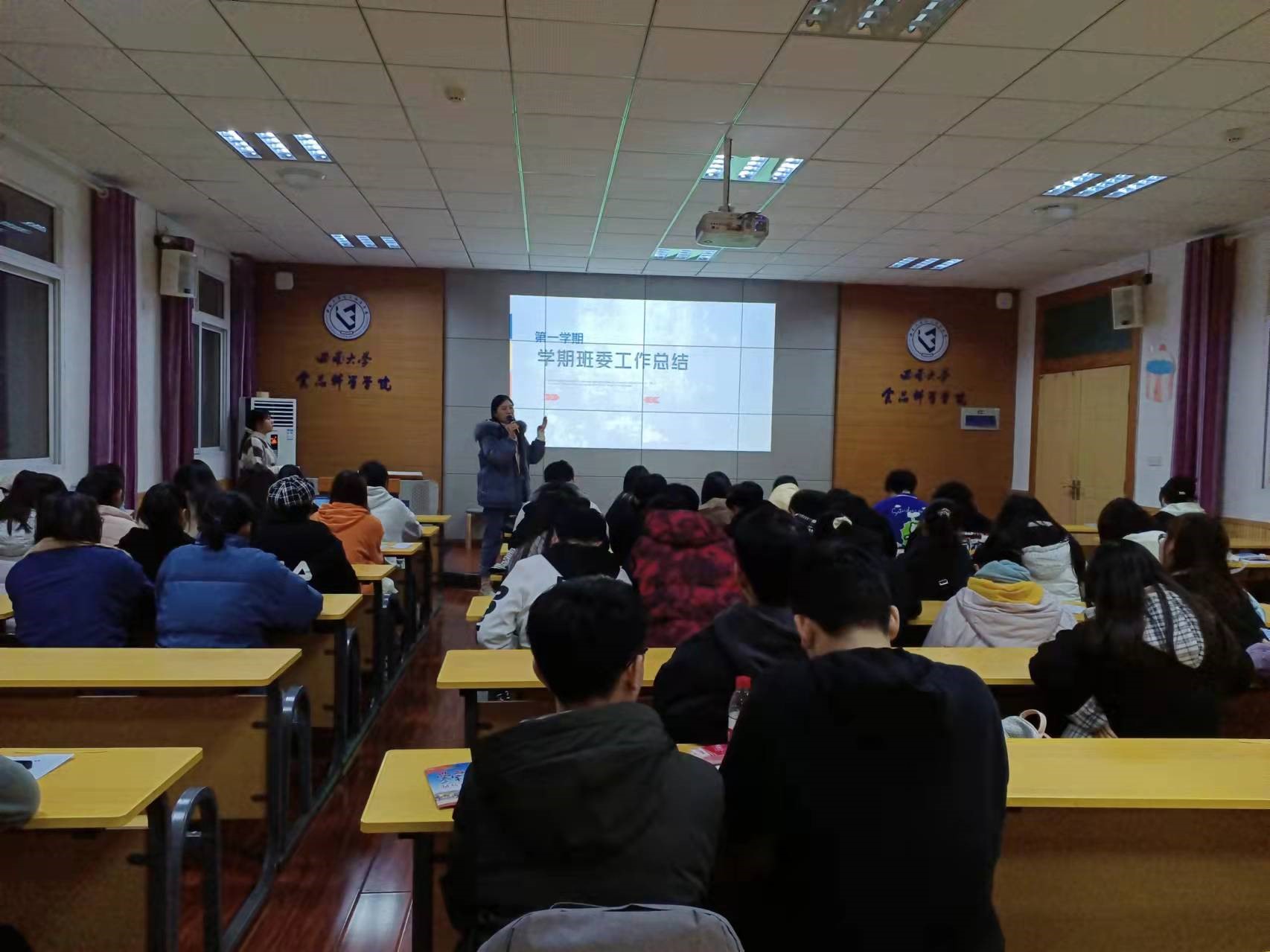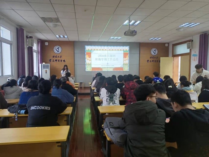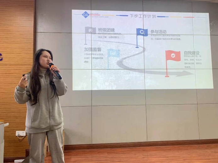 辅导员杨希做总结点评,她充分肯定了本学期各位班委的辛勤付出和班级取得的成绩,同时指出了班级工作中仍存在的不足和相应的整改措施。对于述职报告的汇报情况,她讲道:一份好的述职报告应该分类分层,突出亮点,言语生动,贴合实际,并对日后班委述职的内容板块提出了建议,希望班委能够在每学期的述职报告会上不断提升语言表达、逻辑思维、办公软件运用等多方面的能力,并在每次总结工作会上能充分交流、学习经验、获取反思。最后辅导员杨希从诚信应考、员工安全问题以及国家2022年征兵工作的宣讲等方面对期末工作进行了整体安排。