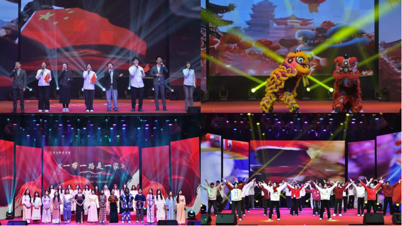 荣誉盛典结束后,迎新晚会精彩上演。晚会节目形式多样,内容丰富,涵盖了歌舞、朗诵、情景剧等多种艺术形式。情景茶艺表演《千年桥遇,茶韵流芳》尽显千年茶韵;国际员工大合唱传递丝路精神与跨国情谊;武术舞狮《武韵狮魂》尽显中华传统文化的独特魅力。此外,师生合唱、舞蹈串烧等节目也各具特色,一次次将晚会推向高潮。