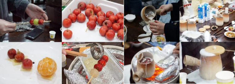 随后的手作与实操环节精彩纷呈。同学们兴致勃勃地动手制作糖葫芦,酸甜可口的手作成果让现场充满欢声笑语。紧接着,大家分组尝试煮制藏式酥油咸奶茶、糯米桂花烤奶等特色养生奶茶,各组成员分工协作,在亲手操作中体会着煮茶的乐趣与传统技艺的魅力。