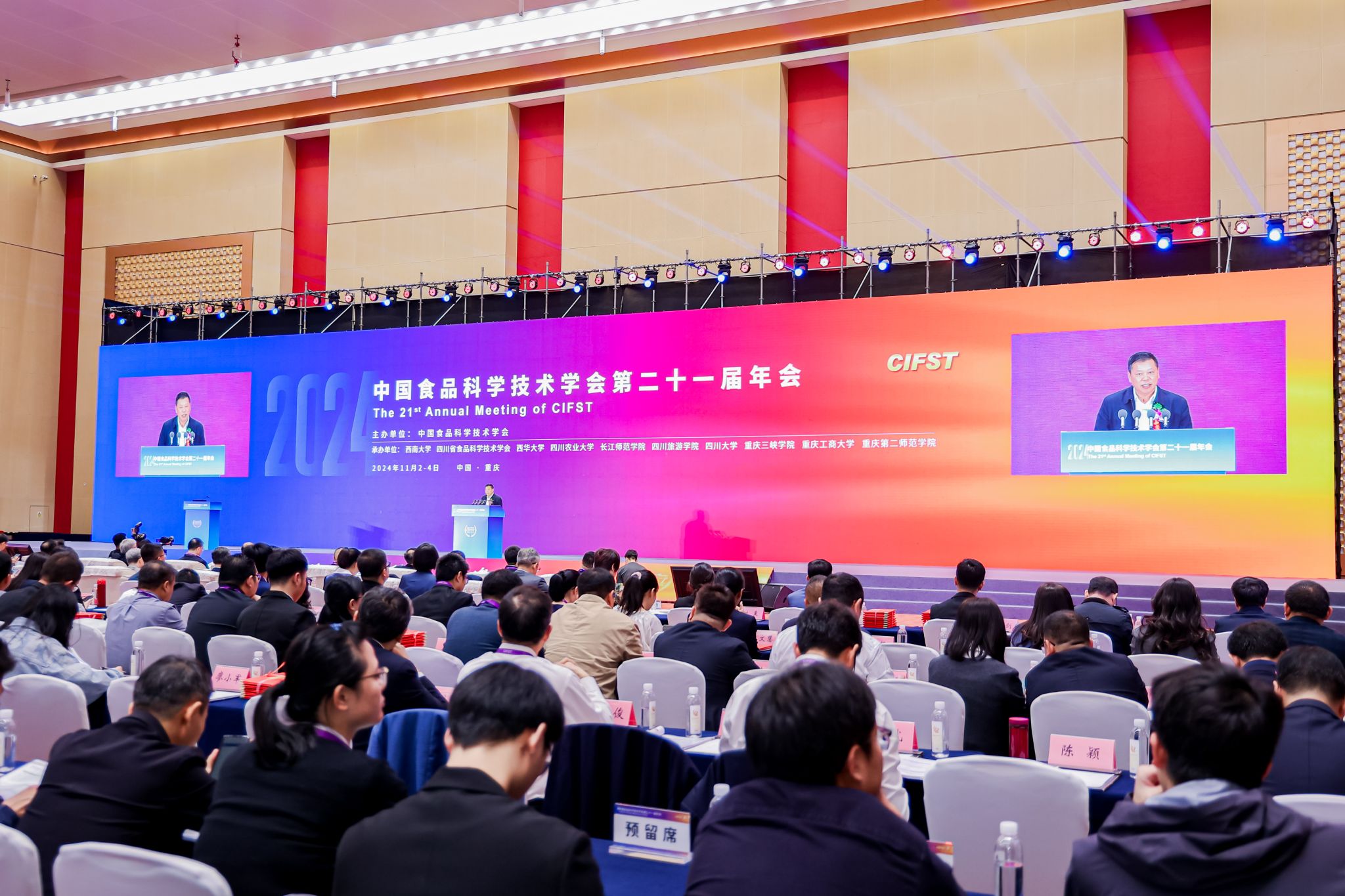 11月3日至4日,由公司牵头承办的中国食品科学技术学会第二十一届年会在悦来国际会议中心召开。中国食品科学技术学会名誉理事长孟素荷,孙宝国、谢剑平、朱蓓薇、陈坚、钱锋、任发政、李培武、单杨、谢明勇、金征宇、薛长湖等11位中国工程院院士,以及有关专家出席大会。农业农村部中国农村技术开发中心、重庆市人民政府、重庆市农业农村委员会、重庆市科技局相关领导,以及地方政府、科协和200余家高校、科研机构、行业组织、企业的专家学者、青年员工2000余人参会。